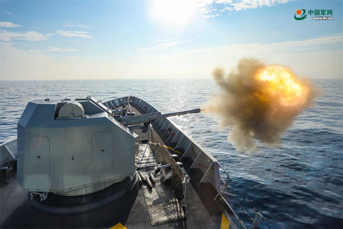 進(jìn)入“敵”艦活動海區(qū),各艦艇加強搜索觀察,及時共享數(shù)據(jù)信息,快速測定目標(biāo)方位。指揮員分析研判戰(zhàn)場態(tài)勢,果斷下令編隊進(jìn)入戰(zhàn)斗航向并實施火炮打擊。霎時,編隊艦艇火力全開,一發(fā)發(fā)炮彈呼嘯出膛,隆隆炮聲響徹???,目標(biāo)區(qū)域擊起條條水柱。