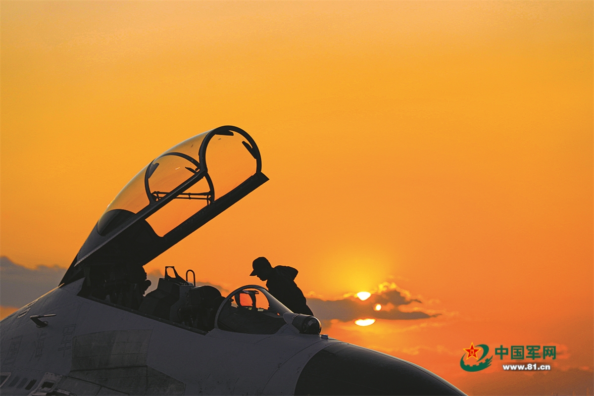 機(jī)務(wù)人員檢查戰(zhàn)機(jī),做好夜間出動準(zhǔn)備。
