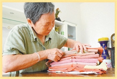 湯春梅仔細(xì)整理一面面褪色的國旗。圖為姚雨婷攝