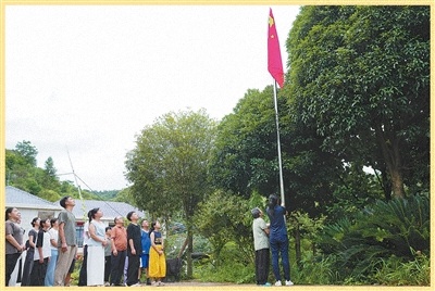 拿著鋤頭出工的鄉(xiāng)親,晨起的學(xué)生,專程過來的男女老少……30多名村民圍在旗桿邊,自覺立正、唱國歌、行注目禮,用堅定的眼神注視著飄揚(yáng)的紅旗。山風(fēng)與鳥鳴,為齊唱的國歌聲伴奏。
