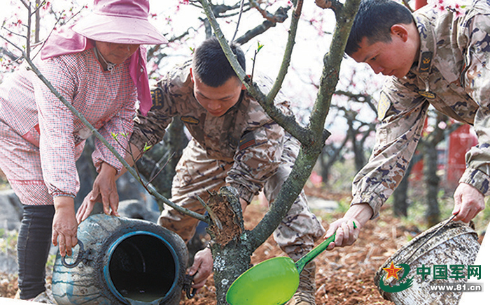 武警貴州總隊黔西南支隊官兵在普梯村萬畝桃林與村民一起栽桃樹。李梓良攝