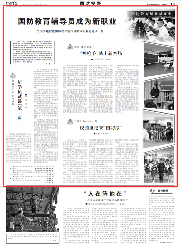 2024年,《國(guó)防教育輔導(dǎo)員國(guó)家職業(yè)標(biāo)準(zhǔn)》頒布,為這一群體明確職業(yè)化發(fā)展方向。近年來,全國(guó)多地推進(jìn)國(guó)防教育輔導(dǎo)員人才培養(yǎng)和就業(yè)支持體系建設(shè),師資培訓(xùn)班陸續(xù)開班,多所中小學(xué)校向“兵教師”發(fā)放聘書、建立駐校教官制度,搭建國(guó)防教育輔導(dǎo)員就業(yè)平臺(tái),讓“國(guó)防綠”在校園深深扎根、茁壯成長(zhǎng)。請(qǐng)看一組報(bào)道。