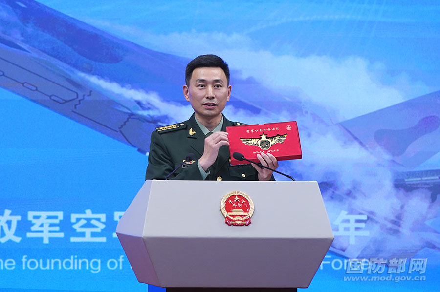 空軍的戰(zhàn)友設計制作了紀念品,委托我們送給大家一些。這是一個空軍徽標,一面是戰(zhàn)略軍種的特色標識,一面是人民空軍建設發(fā)展的12個紅色地標。下面,再請大家看一個短片《去云?!?,希望大家繼續(xù)關(guān)注中國空軍的建設發(fā)展。