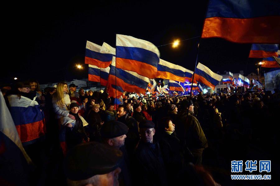 3月16日晚,在烏克蘭克里米亞辛菲羅波爾市,人們在克里米亞政府大樓前的列寧廣場上手舉俄羅斯國旗,參加全民公決慶祝晚會(huì)?! ?014年克里米亞自治共和國全民公決投票于當(dāng)?shù)貢r(shí)間20時(shí)結(jié)束??死锩讈喒埠蛧紊鐣?huì)研究院進(jìn)行的出口民調(diào)初步結(jié)果顯示,贊成重歸俄羅斯的選民占總投票人數(shù)的93%?! ⌒氯A社記者沙達(dá)提攝