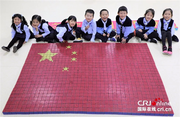 沈陽某幼兒園內(nèi),老師帶著小朋友們用魔方拼出了一面五星紅旗。攝影:李子平