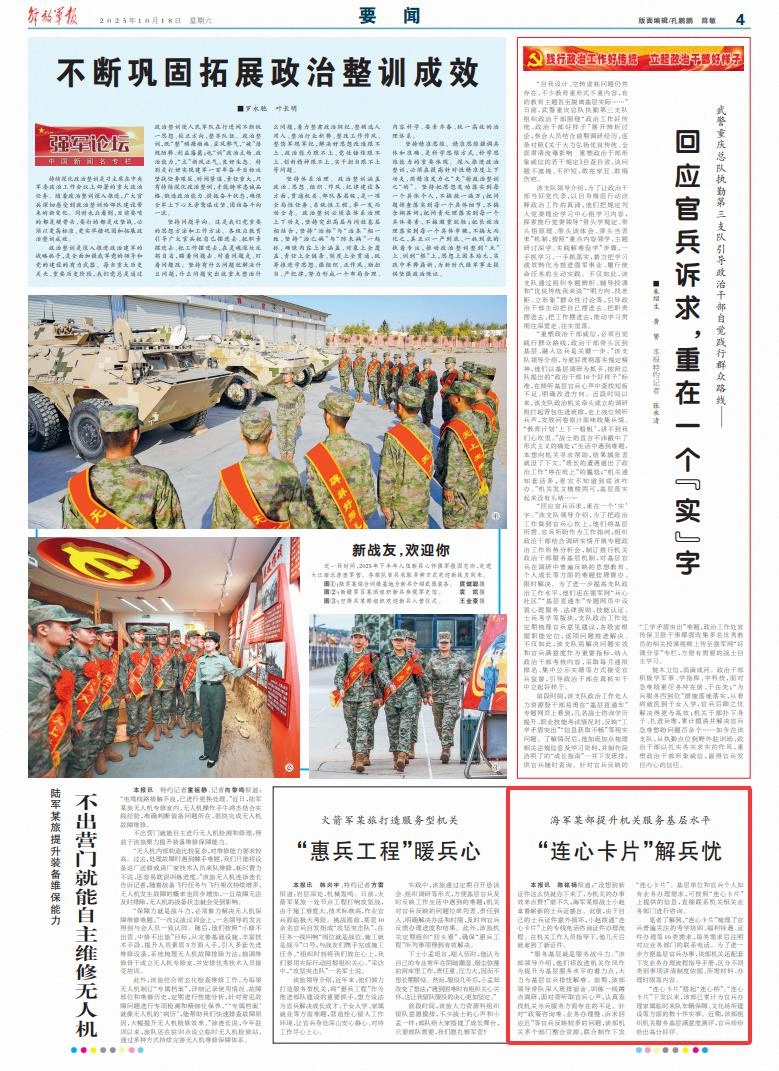 “服務(wù)基層就是服務(wù)戰(zhàn)斗力?!痹摬款I(lǐng)導介紹,他們將改進機關(guān)作風作為提升為基層服務(wù)水平的著力點,大力為基層官兵排憂解難。前期,該部領(lǐng)導帶隊深入班排宿舍、訓練一線蹲點調(diào)研,面對面聽取官兵心聲,認真查找機關(guān)為兵服務(wù)方面存在的不足。針對“政策咨詢難、業(yè)務(wù)辦理慢、訴求回應(yīng)遲”等官兵反映較多的問題,該部機關(guān)多個部門整合資源,聯(lián)合制作下發(fā)“連心卡片”。基層單位和官兵個人如有業(yè)務(wù)辦理需求,可按照“連心卡片”上提供的信息,直接聯(lián)系機關(guān)相關(guān)業(yè)務(wù)部門進行咨詢。