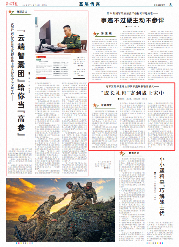 “成長(zhǎng)禮包”送軍屬是海軍某部探索建立部隊(duì)家庭聯(lián)教聯(lián)育模式開展的活動(dòng)。此前,他們?cè)谡{(diào)研時(shí)發(fā)現(xiàn)一個(gè)情況:在與家人溝通時(shí),戰(zhàn)士出于各種考量,往往以“都挺好”“別問(wèn)了”之類的回答應(yīng)對(duì)詢問(wèn)。這很容易讓軍屬產(chǎn)生不必要的擔(dān)憂,但過(guò)多追問(wèn),又可能引發(fā)矛盾甚至失泄密問(wèn)題。