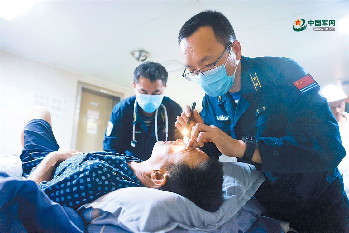 護(hù)航編隊(duì)軍醫(yī)為貨船患者進(jìn)行檢查。翟旭民 攝