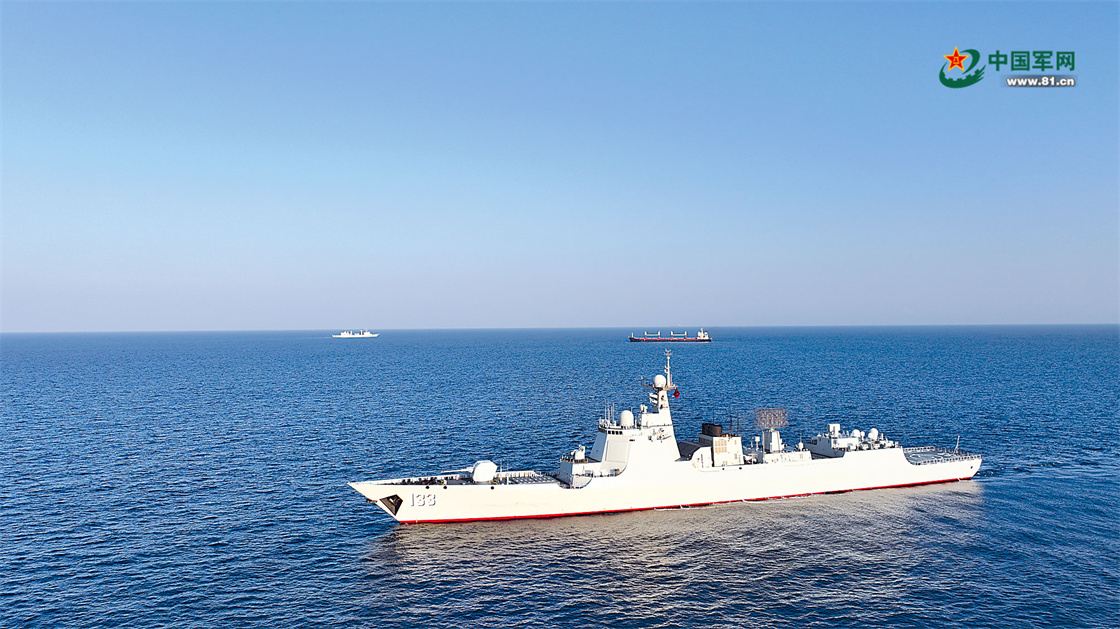包頭艦、高郵湖艦為貨船護(hù)航。任科 攝