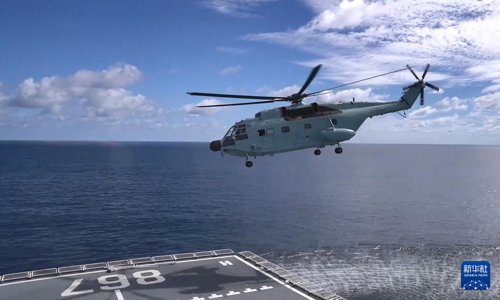9月23日,艦載直升機(jī)從中國(guó)海軍“絲路方舟”號(hào)醫(yī)院船上起飛。新華社發(fā)