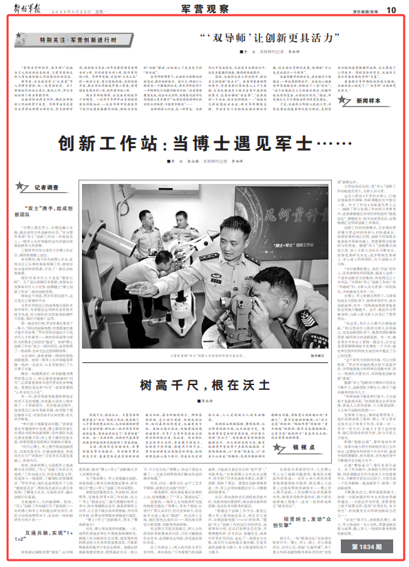 交流越深入,方向越清晰。很快,“雙士”創(chuàng)新工作站就打開了新局面——有的博士和軍士共同提出研究項(xiàng)目,有的主動(dòng)結(jié)成幫帶對(duì)子,還有的一同擬制研究方向計(jì)劃……