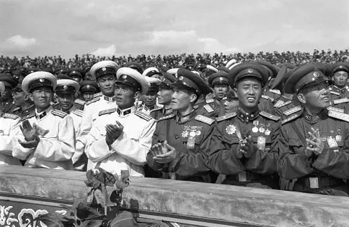 參加1955年國慶觀禮的陸??杖娷姽?,佩戴不同的領章。