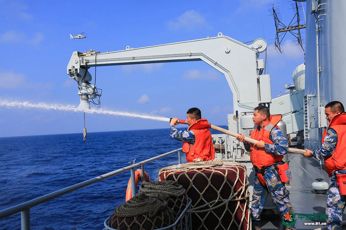 宿遷艦艙面火勢迅猛,在綿陽艦艙面3個部位,高壓細水霧保持不間斷噴淋,在連續(xù)降溫作業(yè)后,宿遷艦艙面火勢基本被控制。