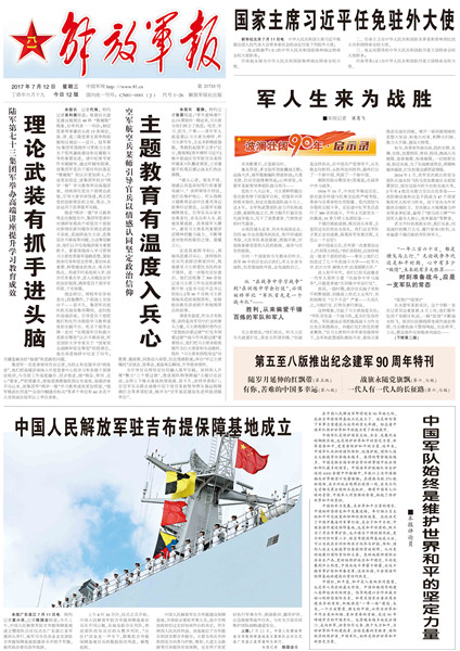 2017年7月11日,中國(guó)人民解放軍駐吉布提保障基地成立暨部隊(duì)出征儀式,在廣東湛江某軍港碼頭舉行。該基地位于吉布提共和國(guó)首都吉布提市,主要為我在非洲和西亞方向參與護(hù)航、維和、人道主義救援等任務(wù)提供有效保障,也有利于我更好執(zhí)行軍事合作、聯(lián)演聯(lián)訓(xùn)、撤僑護(hù)僑、應(yīng)急救援等海外任務(wù),與有關(guān)方面共同維護(hù)國(guó)際戰(zhàn)略通道安全。8月1日,駐吉布提保障基地部隊(duì)進(jìn)駐營(yíng)區(qū),標(biāo)志著我國(guó)首個(gè)海外保障基地建成和投入使用。