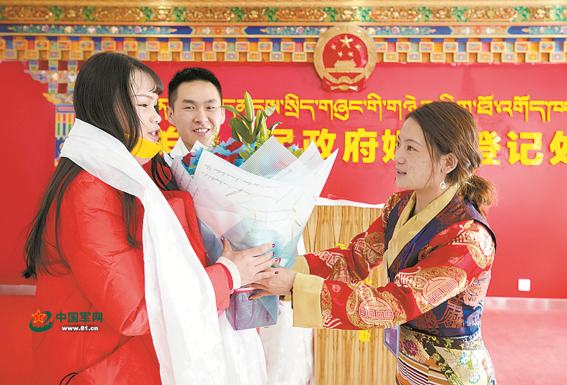 歐城和陳雨(左一)到拉薩市市民服務(wù)中心領(lǐng)取結(jié)婚證時,工作人員為他們送上祝福的鮮花。
