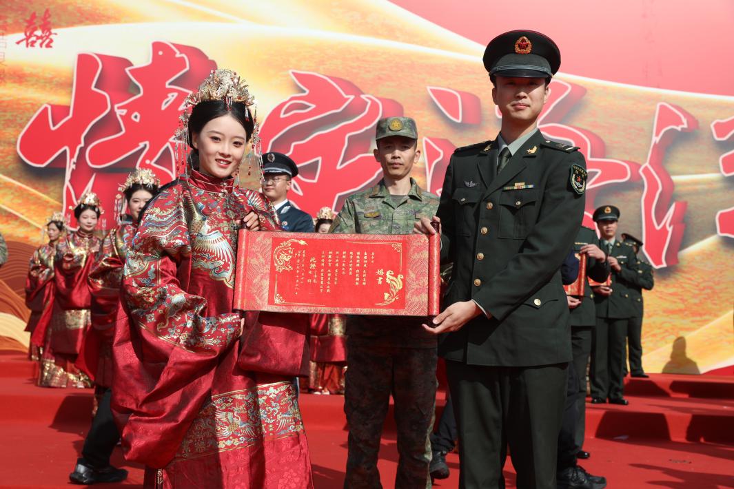 上午10時(shí),鑼鼓震天、吉獅歡舞,80對(duì)新人手挽手,緩緩踏上紅毯?;槎Y儀式正式開啟,“卻扇納祥”環(huán)節(jié)中新娘將團(tuán)扇交予新郎,象征攜手開啟新生活;“禮拜天地”環(huán)節(jié)中,一拜感恩祖國(guó)護(hù)佑山河無(wú)恙,二拜感恩父母養(yǎng)育與部隊(duì)培養(yǎng),三拜感恩彼此相許守諾言;緊接著“喜印婚書”,彰顯新人們“執(zhí)子之手,與子偕老”的決心;再行“合巹成喜”,寓意未來(lái)甘苦與共;最后“執(zhí)手盟誓”,以莊重承諾定格幸福時(shí)刻。