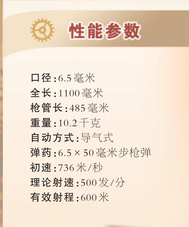 “歪把子”采用導(dǎo)氣式自動原理,槍管外側(cè)設(shè)有螺紋狀散熱片以輔助降溫。該槍可使用與三八式步槍通用的6.5×50毫米步槍彈及5發(fā)標(biāo)準(zhǔn)彈夾,但受口徑限制,槍彈威力較為有限。