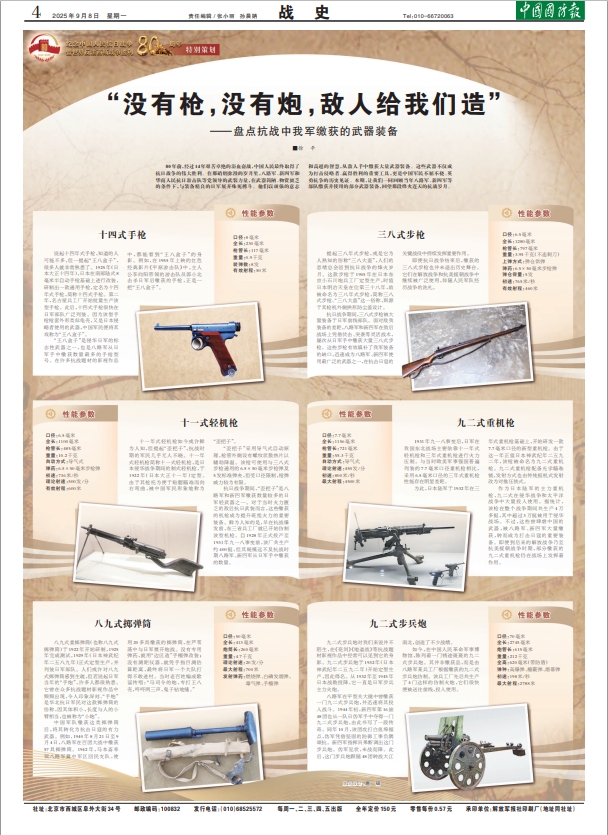 80年前,經(jīng)過14年艱苦卓絕的浴血奮戰(zhàn),中國人民最終取得了抗日戰(zhàn)爭的偉大勝利。在那硝煙彌漫的歲月里,八路軍、新四軍和華南人民抗日游擊隊等黨領(lǐng)導(dǎo)的武裝力量,在武器簡陋、物資匱乏的條件下,與裝備精良的日軍展開殊死搏斗。他們以頑強(qiáng)的意志和高超的智慧,從敵人手中繳獲大量武器裝備。這些武器不僅成為打擊侵略者、贏得勝利的重要工具,更是中國軍民不屈不撓、英勇抗?fàn)幍臍v史見證。本期,讓我們一同回顧當(dāng)年八路軍、新四軍等部隊繳獲并使用的部分武器裝備,回望那段烽火連天的抗戰(zhàn)歲月。