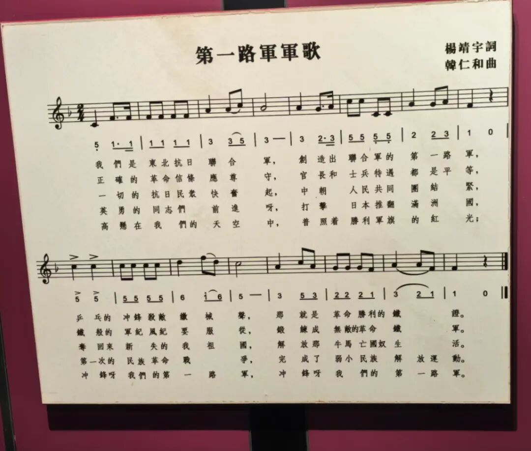 楊靖宇創(chuàng)作的《東北抗日聯(lián)軍第一路軍軍歌》,唱出了抗聯(lián)將士們永不屈服堅(jiān)持戰(zhàn)斗的理由:“奪回來(lái)所失的我祖國(guó),解放那牛馬亡國(guó)奴生活”。來(lái)源:楊靖宇烈士陵園暨東北抗日聯(lián)軍紀(jì)念館