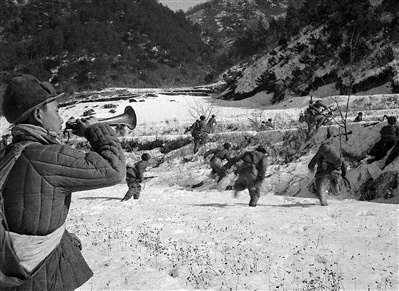 抗美援朝戰(zhàn)場(chǎng),志愿軍某部司號(hào)員吹響沖鋒號(hào),官兵向敵發(fā)起沖擊。