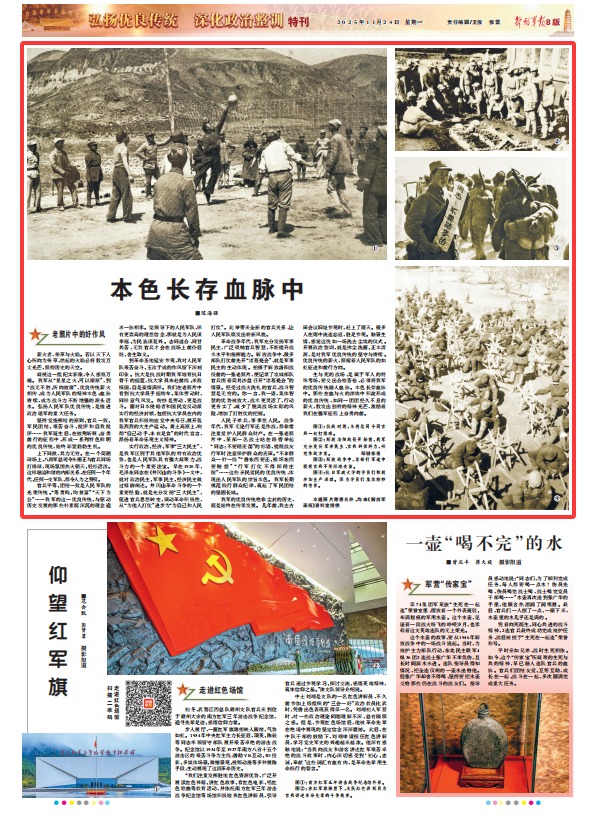 凝視這一組紀(jì)實(shí)影像,令人感慨萬(wàn)端。我軍從“星星之火、可以燎原”,到“戰(zhàn)無(wú)不勝、所向披靡”,優(yōu)良傳統(tǒng)薪火相傳,成為人民軍隊(duì)的精神本色;血脈賡續(xù),成為戰(zhàn)斗力不斷增強(qiáng)的源頭活水。弘揚(yáng)人民軍隊(duì)優(yōu)良傳統(tǒng),是推進(jìn)政治建軍的重大任務(wù)。