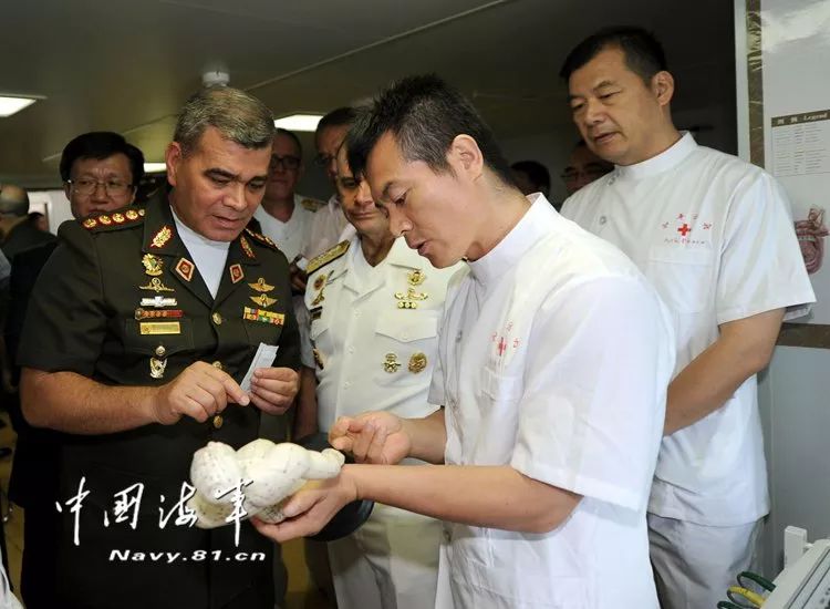 委部長理事會副主席兼國防部長帕德里諾?洛佩斯參觀中國海軍和平方舟醫(yī)院船時饒有興趣了解中醫(yī)針灸知識。江山 攝