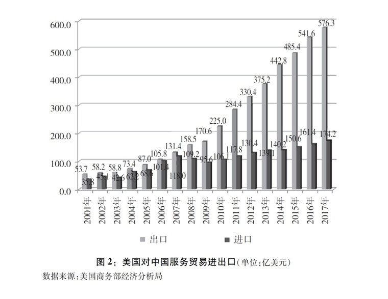 美國服務(wù)業(yè)高度發(fā)達(dá),產(chǎn)業(yè)門類齊全,國際競爭力強(qiáng)。隨著中國經(jīng)濟(jì)發(fā)展和人民生活水平提升,服務(wù)需求明顯擴(kuò)大,雙方服務(wù)貿(mào)易快速增長。據(jù)美國方面統(tǒng)計(jì),2007-2017年,中美服務(wù)貿(mào)易額由249.4億美元擴(kuò)大到750.5億美元,增長了2倍。2017年,據(jù)中國商務(wù)部統(tǒng)計(jì),美國是中國第二大服務(wù)貿(mào)易伙伴;據(jù)美國商務(wù)部統(tǒng)計(jì),中國是美國第三大服務(wù)出口市場。