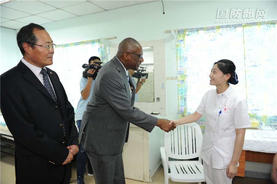 ▲安巴總督威廉斯在中國駐安巴大使王憲民的陪同下看望慰問和平方舟醫(yī)護(hù)人員。