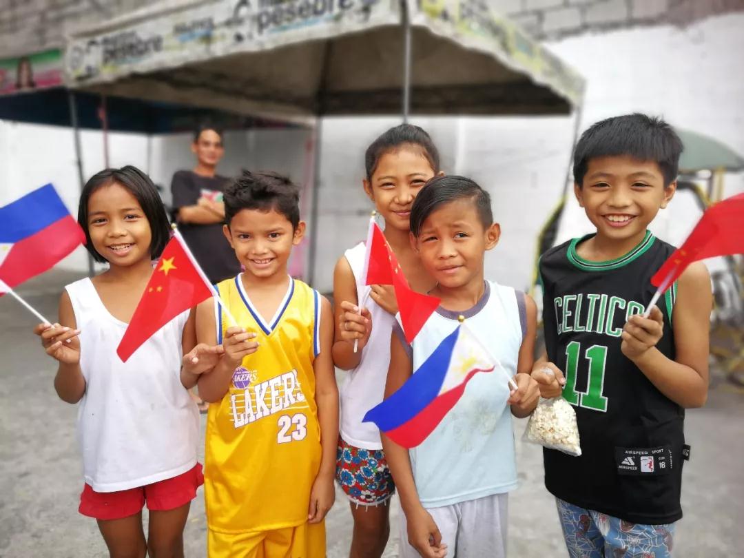 △一群菲律賓孩子手持兩國(guó)國(guó)旗歡迎習(xí)近平主席。(央視記者甘露拍攝)