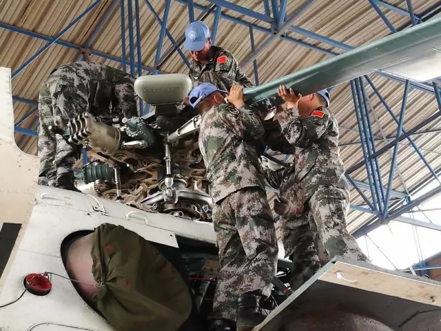 ▲7月2日,在蘇丹喀土穆國際機場,中國首支維和直升機分隊先遣組人員安裝一架直升機的主旋翼槳片。