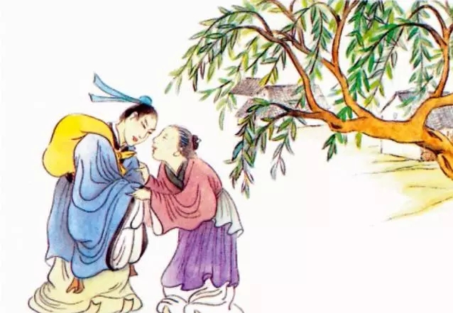 孟郊出遠(yuǎn)門時(shí),母親把他送到村口。孟郊握著母親長(zhǎng)滿老繭的手,看著母親頭上的幾縷白發(fā),眼眶濕潤(rùn)。