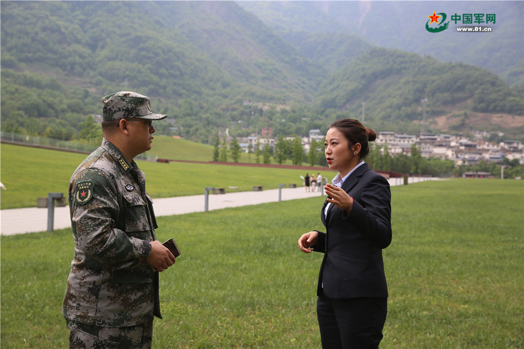 “5·12”汶川特大地震博物館講解員王華蓉(右)正在接受中國軍網記者采訪。中國軍網記者喬夢 攝