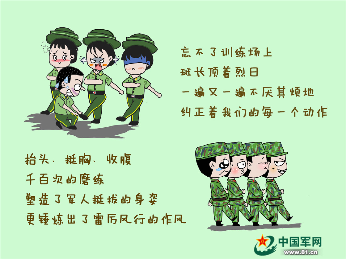 忘不了訓練場上,班長頂著烈日,一遍又一遍不厭其煩地糾正著我們的每一個動作:抬頭、挺胸、收腹,千百次的磨練,塑造了軍人挺拔的身姿,更錘煉出了雷厲風行的作風。
