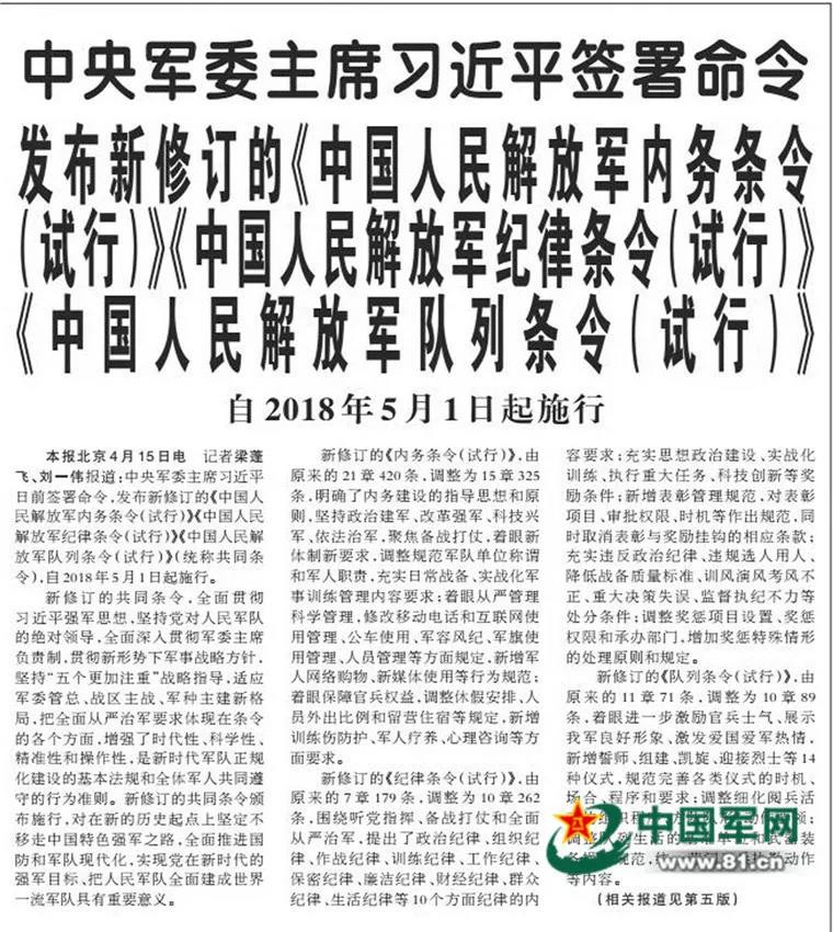 據(jù)《解放軍報(bào)》4月16日?qǐng)?bào)道,中央軍委主席習(xí)近平簽署命令,發(fā)布新修訂的《中國(guó)人民解放軍內(nèi)務(wù)條令(試行)》《中國(guó)人民解放軍紀(jì)律條令(試行)》《中國(guó)人民解放軍隊(duì)列條令(試行)》(統(tǒng)稱共同條令),自2018年5月1日起施行。