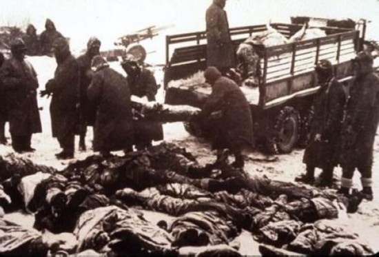 美軍生還者將堆積的戰(zhàn)友尸體搬上卡車(chē)。
