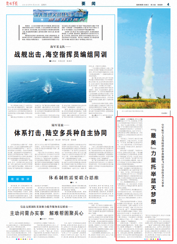 跨代改裝“大國重器”、飛赴境外執(zhí)行任務(wù)、運籌空運投送力量……陳思麒口中那些激動人心的演訓場景,深深吸引了現(xiàn)場的新飛行學員?!皬倪@里飛向空天,從這里飛向戰(zhàn)場?!边@句豪氣沖天的誓言,讓學員張錦程心潮澎湃。他說,藍天不僅是新飛行學員實現(xiàn)抱負的舞臺,更是未來銳意爭鋒的戰(zhàn)場。