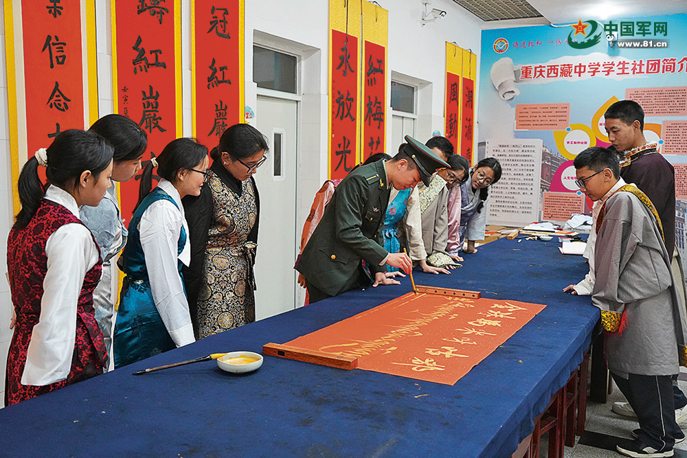 11月6日,信息支援部隊(duì)工程大學(xué)通信士官學(xué)?!凹t巖雪鷹”宣傳隊(duì)隊(duì)員在重慶西藏中學(xué)宣講后,與師生一起參與學(xué)校書法社團(tuán)活動(dòng)。 諶世鑫攝