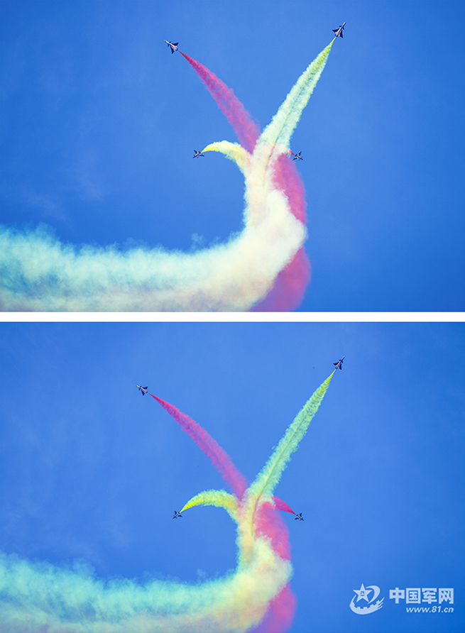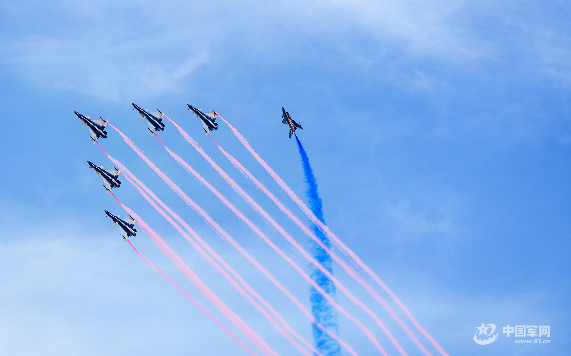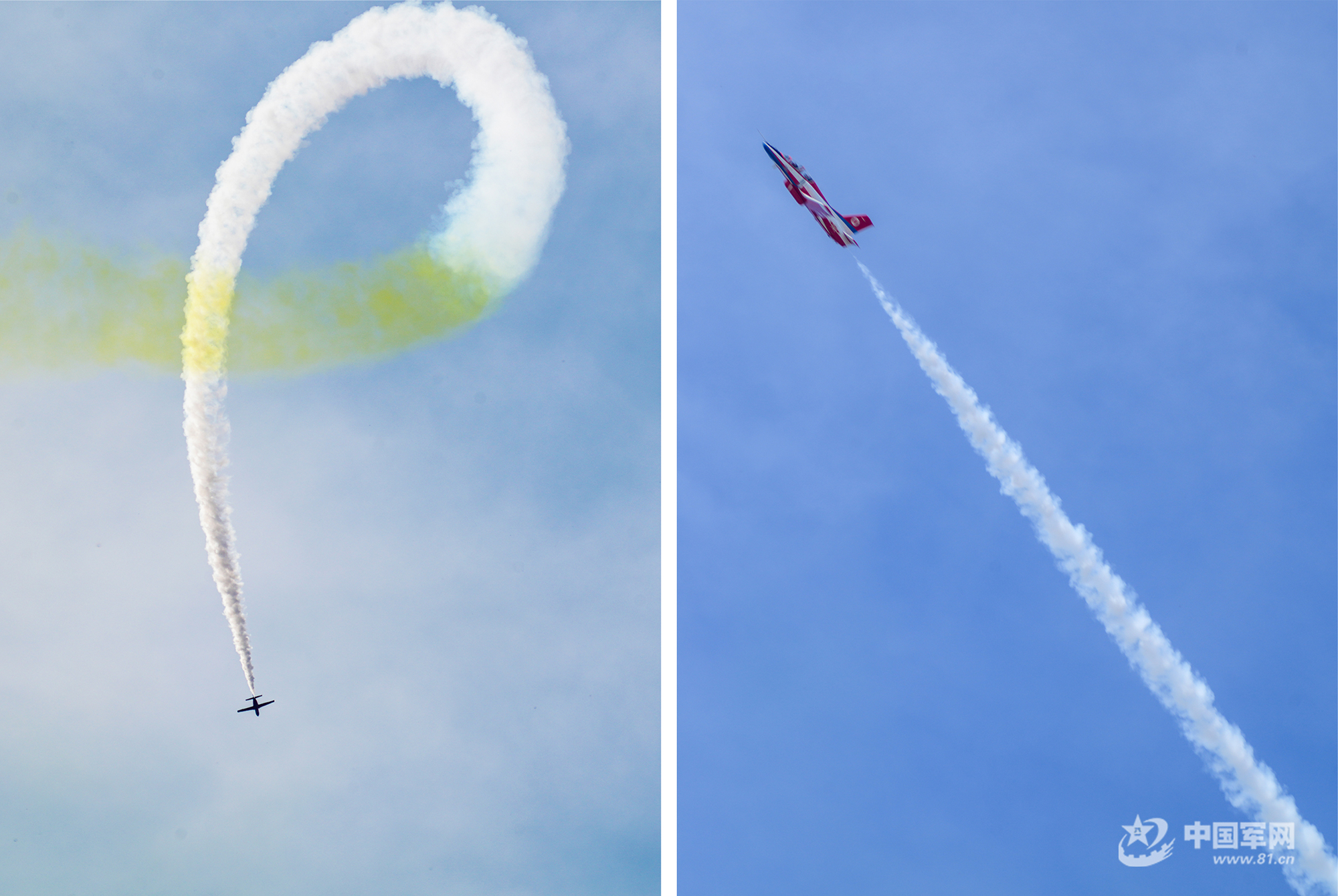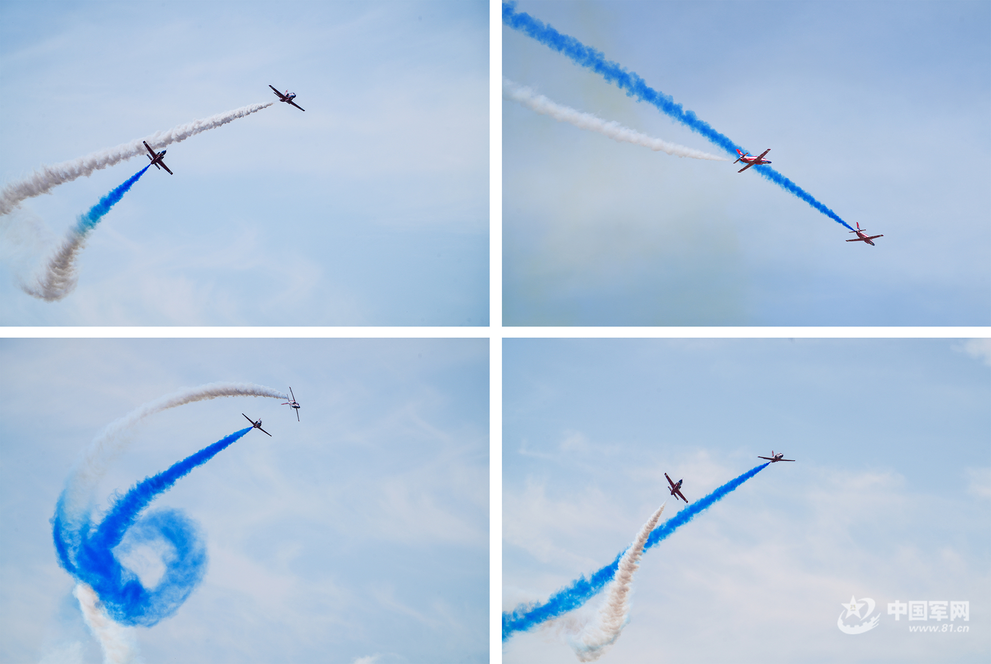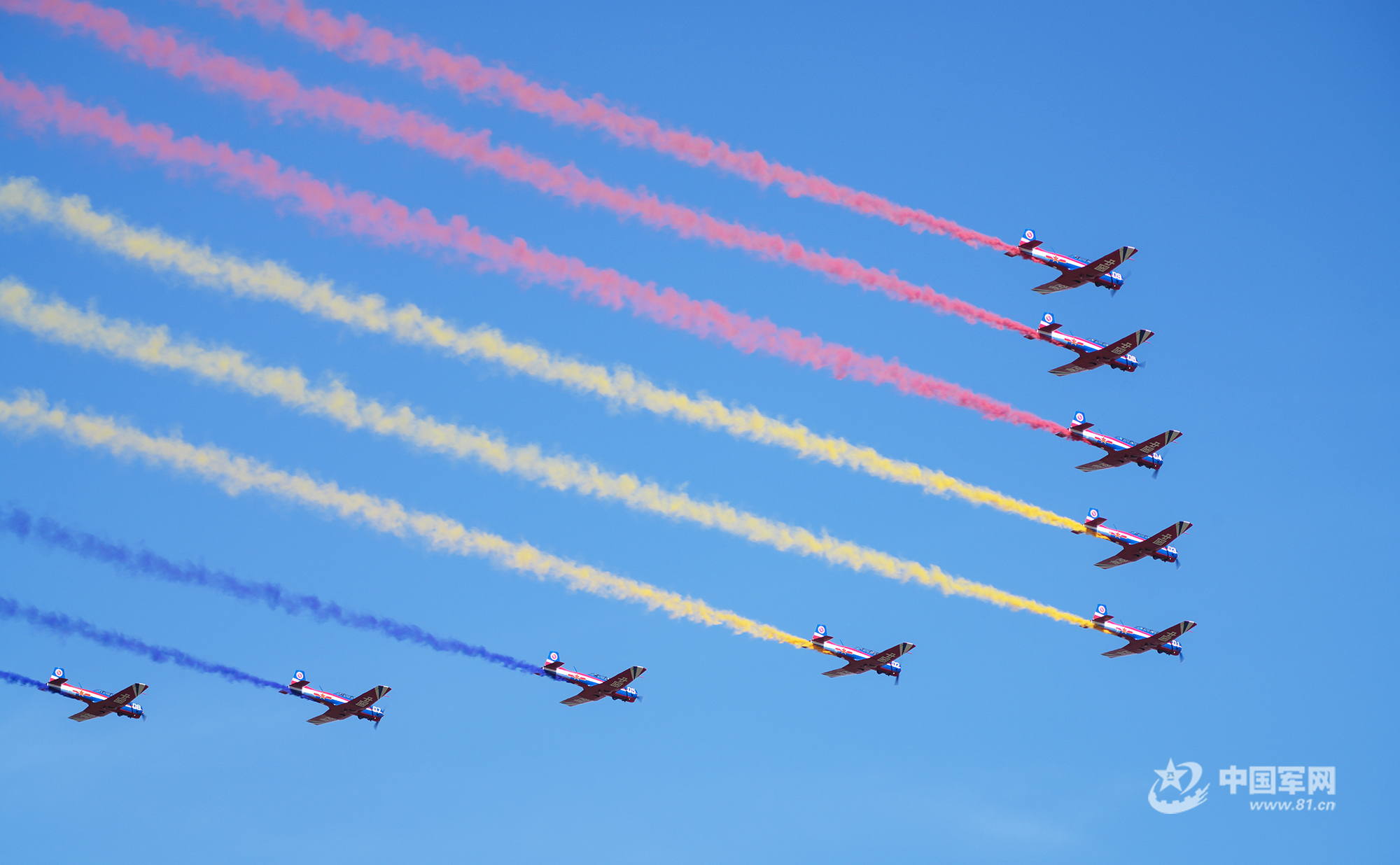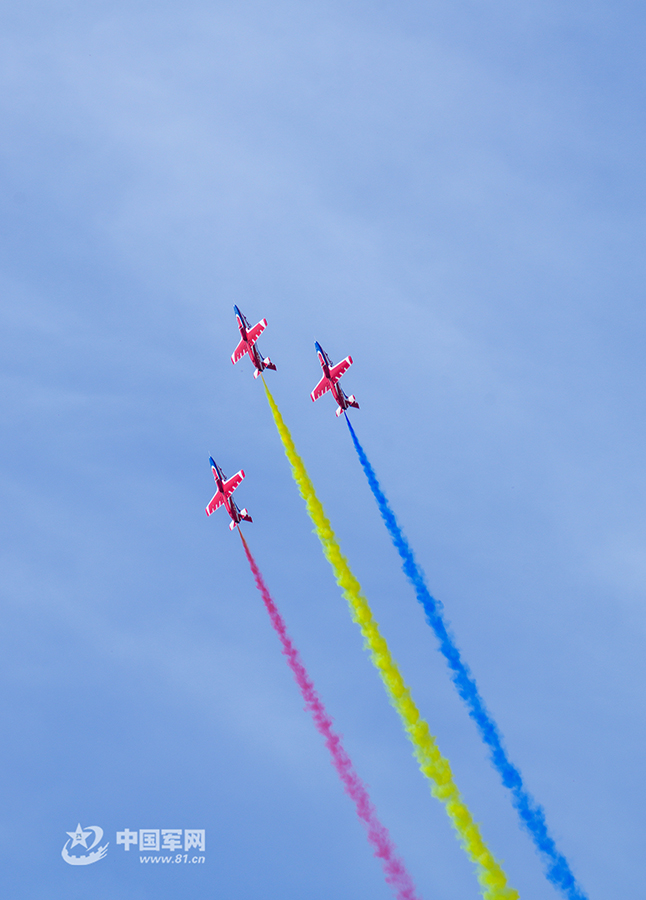 八一飛行表演隊紅黃藍彩煙劃過天際