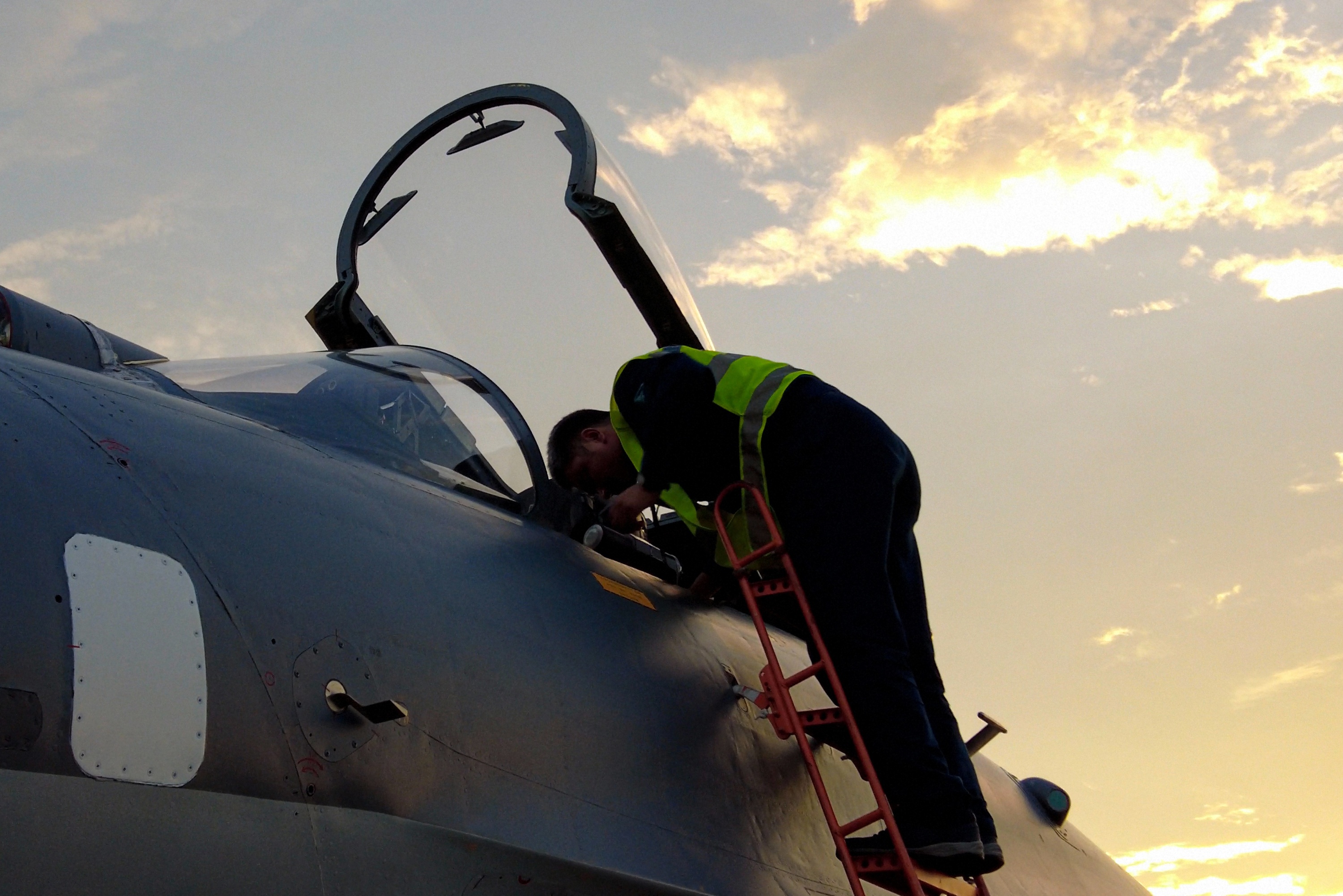 余暉中,機務保障人員檢查戰(zhàn)機