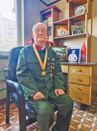 9月7日,北京某干休所。陽光透過書房的窗戶,灑在抗戰(zhàn)老兵張坪(見圖,人民日?qǐng)?bào)記者潘俊強(qiáng)攝)身上,軍裝上的榮譽(yù)勛章熠熠生輝。墻上、桌臺(tái)上是張坪不同時(shí)期的紀(jì)念照片,串聯(lián)起百歲老人的革命生涯。