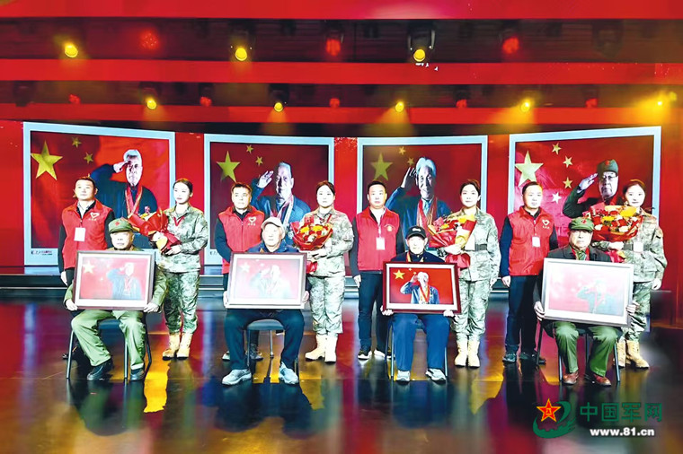 10月29日,在攝影展開幕儀式現(xiàn)場,4名老兵手捧獲贈的肖像照合影。張宏果攝