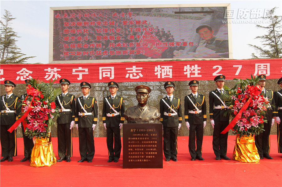 在反映蘇寧事跡的電影《炮兵少?!返闹黝}曲中,兩名禮兵捧著蘇寧雕像從隊(duì)伍中間緩緩走過,兩名禮兵分列兩側(cè)護(hù)送。