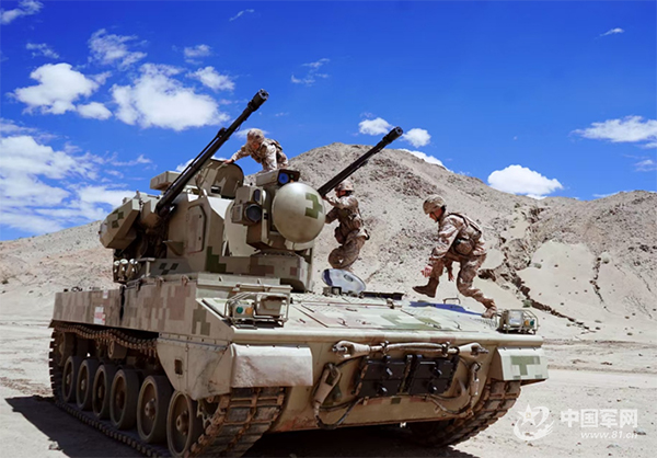 ▲西部戰(zhàn)區(qū)某旅防空分隊官兵在陸空聯合對抗演練中快速登車,準備抗擊“來襲敵機”。