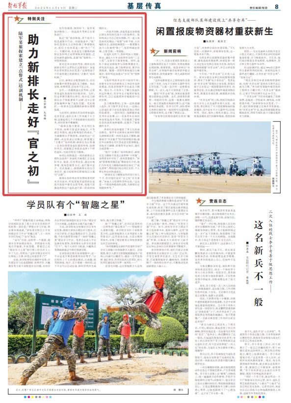 “推行‘點餐式’培訓(xùn)機制后,新排長見習鍛煉不再是以前那種‘大呼隆’,變得更有針對性了,質(zhì)效顯著提升?!痹撀谩肮芾斫逃7哆B”蔡指導(dǎo)員介紹,他們?yōu)樗幸娏曞憻挼男屡砰L細化了“成長清單”,幫助他們結(jié)合崗位實際、個人特長和志向快速成長。