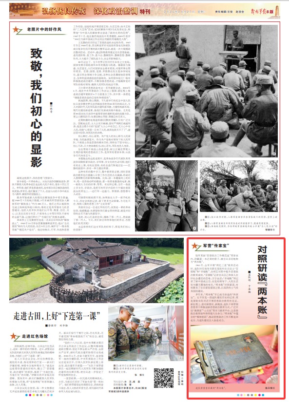 1961年,全軍開展“兩憶三查”教育活動時,連隊(duì)時任指導(dǎo)員薛克寬組織官兵設(shè)立“苦情賬”和“幸福賬”,在相互對照中提升思想政治教育成效。“苦情賬”記錄官兵自己和家人在舊社會遭受的苦難,字字血淚;“幸福賬”則記錄了新中國成立后,在黨的領(lǐng)導(dǎo)下,人民生活發(fā)生翻天覆地的變化?!皟杀举~”對照著讀,有效激發(fā)了官兵愛黨愛國之情,以高昂的士氣投身國防建設(shè)。