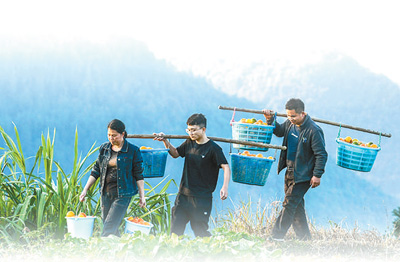 貴州省從江縣停洞鎮(zhèn)東勤村扶貧干部及當(dāng)?shù)卮甯刹堪徇\(yùn)吊瓜。新華社記者 楊文斌攝