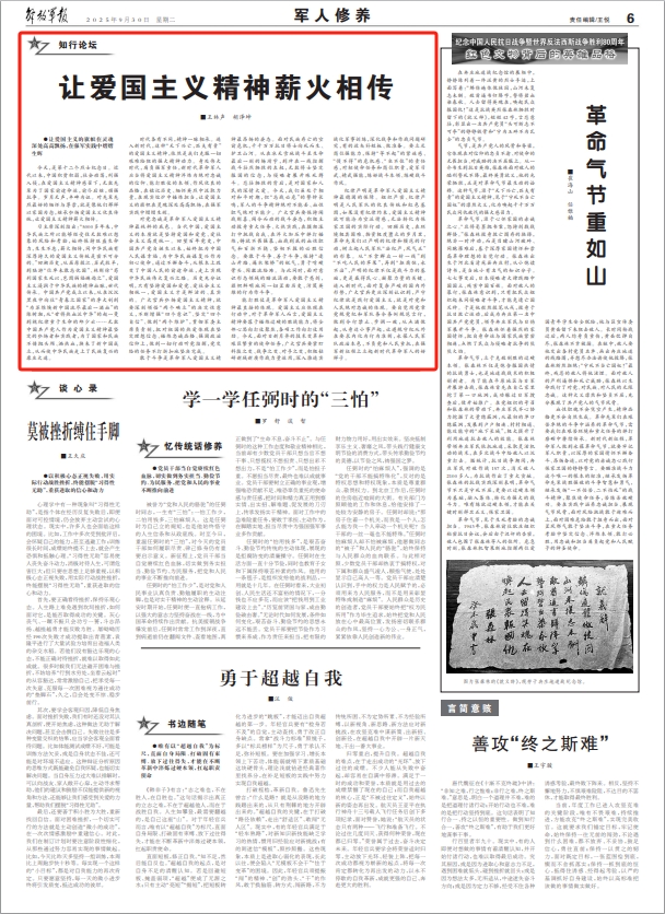時代各有不同,精神一脈相承。進入新時代,這種“天下興亡,匹夫有責(zé)”的愛國主義精神,依然是我們克服一切艱難險阻的強大精神動力。身處偉大時代,肩負強軍重任,新時代革命軍人應(yīng)當將愛國主義精神淬煉為絕對忠誠的信仰、能打勝仗的本領(lǐng)、作風(fēng)優(yōu)良的品格,在銘記歷史、緬懷英烈中汲取力量,在現(xiàn)實熔爐中錘煉擔當,讓愛國主義的旗幟在靈魂深處高高飄揚,在強軍實踐中熠熠生輝。