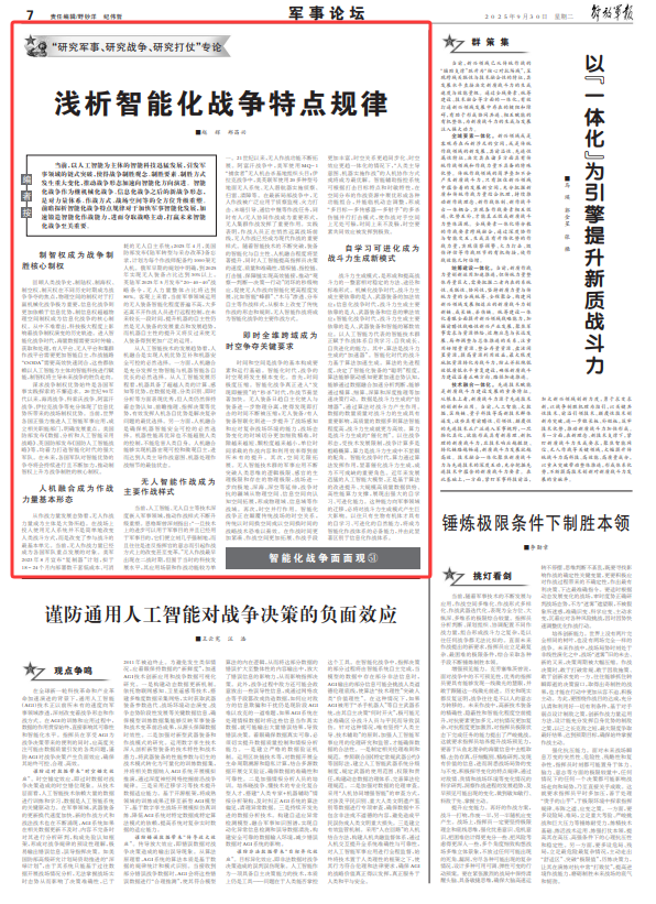 當(dāng)前,以人工智能為主體的智能科技迅猛發(fā)展,引發(fā)軍事領(lǐng)域的鏈?zhǔn)酵黄?,使得?zhàn)爭(zhēng)制勝觀念、制勝要素、制勝方式發(fā)生重大變化,推動(dòng)戰(zhàn)爭(zhēng)形態(tài)加速向智能化方向演進(jìn)。智能化戰(zhàn)爭(zhēng)作為繼機(jī)械化戰(zhàn)爭(zhēng)、信息化戰(zhàn)爭(zhēng)之后的新戰(zhàn)爭(zhēng)形態(tài),是對(duì)力量體系、作戰(zhàn)方式、戰(zhàn)場(chǎng)空間等的全方位升級(jí)重塑。前瞻探析智能化戰(zhàn)爭(zhēng)特點(diǎn)規(guī)律對(duì)于加快軍事智能化發(fā)展,加速鍛造智能化作戰(zhàn)能力,進(jìn)而奪取戰(zhàn)略主動(dòng),打贏未來智能化戰(zhàn)爭(zhēng)至關(guān)重要。