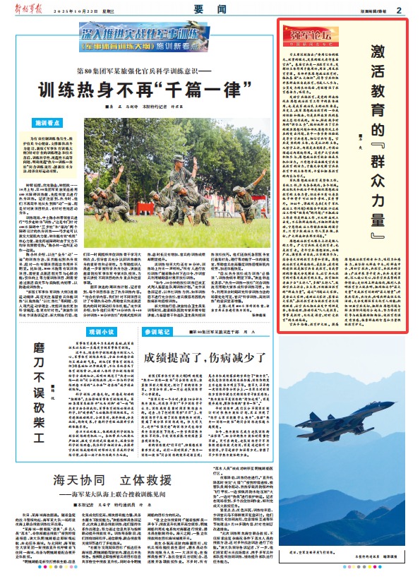 官兵齊拾柴,教育爐火旺。提高思想政治教育的親和力、吸引力和感染力,應堅持從群眾中來、到群眾中去,用好官教兵、兵教官、兵教兵的方法;廣泛開展尊干愛兵、兵兵友愛活動,深入談心交心,培養(yǎng)官兵真摯的革命情誼;走好網(wǎng)上群眾路線,做到人在哪教育重點就在哪,把網(wǎng)絡這個“最大變量”變成教育創(chuàng)新的“最大增量”;開展兵寫兵、兵演兵、兵唱兵群眾性文化活動,充分發(fā)揮強軍文化育人功能;積極回應官兵關切,把解決思想問題與解決實際問題結合起來,努力將教育引導與政策激勵相銜接,使教育有溫度有實感,依靠群眾的智慧和力量燃旺教育爐火。