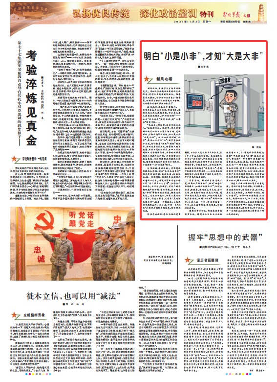 “巴豆雖小壞腸胃,酒杯不深淹死人。”話糙理不糙?,F(xiàn)實中,官兵時常面臨的考驗往往不是立場方向、黨性原則、信仰信念等大問題,而正是這些“小是小非”。何況一些所謂的“小事”,其實一點都不“小”,就拿有些段子來說,它們打著“幽默”“調(diào)侃”的旗號,實則夾雜抹黑丑化、暗箭傷人的負能量,雖然不是政治謠言,可一旦牽扯到部隊這個特殊集體,關乎的同樣是思想和意識的大問題。只有經(jīng)常進行政治體檢,不斷對思想進行提純和凈化,增強思想改造的自覺性和徹底性,才能清除一切“亞健康”因素。
